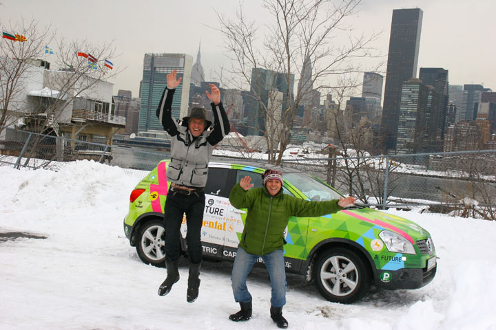 Farvel til USA. 7400 km fik vi kørt i det store land. New York var masser af sne (den mest snefulde januar nogensinde). Vi morede os med at hoppe foran Manhattan inden vi kørte ud til lageret og pakkede Grønne i containeren. På gensyn til Grønne i Spanien. Første marts starter vi på sidste etappe af rejsen jorden rundt.